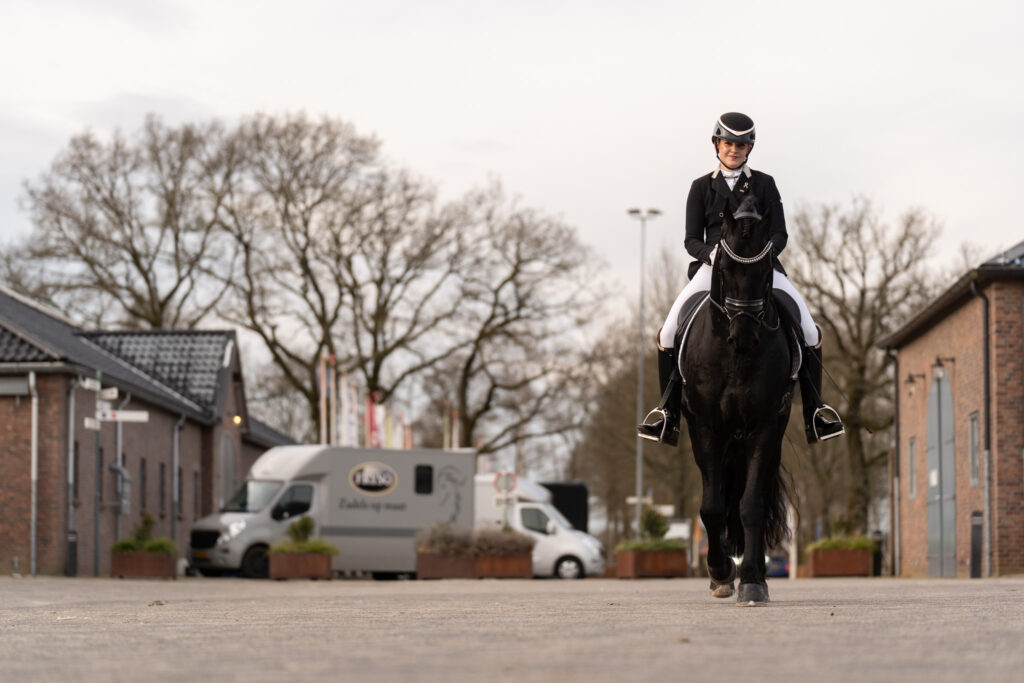 Ik ben Sofi Väisänen, een gepassioneerde amazone uit Noord-Nederland, gespecialiseerd in longeren, dressuurtraining én het uitbrengen van Friese paarden in de sport. Samen met mijn trouwe trainingspaard Fryso’s Jannick (Nane 492) won ik recent de prestigieuze dressuurbokaal in de M1‑klasse tijdens de KFPS indoor competitie, ongeslagen. Daarnaast won ik dit jaar, tijdens de Hynstedagen in Garijp, mijn eerste nationale tuigtitel (na vorig jaar mijn regionale titel) in de damesklasse met dezelfde hengst.